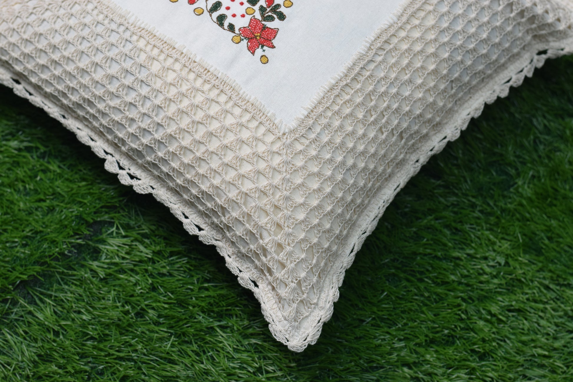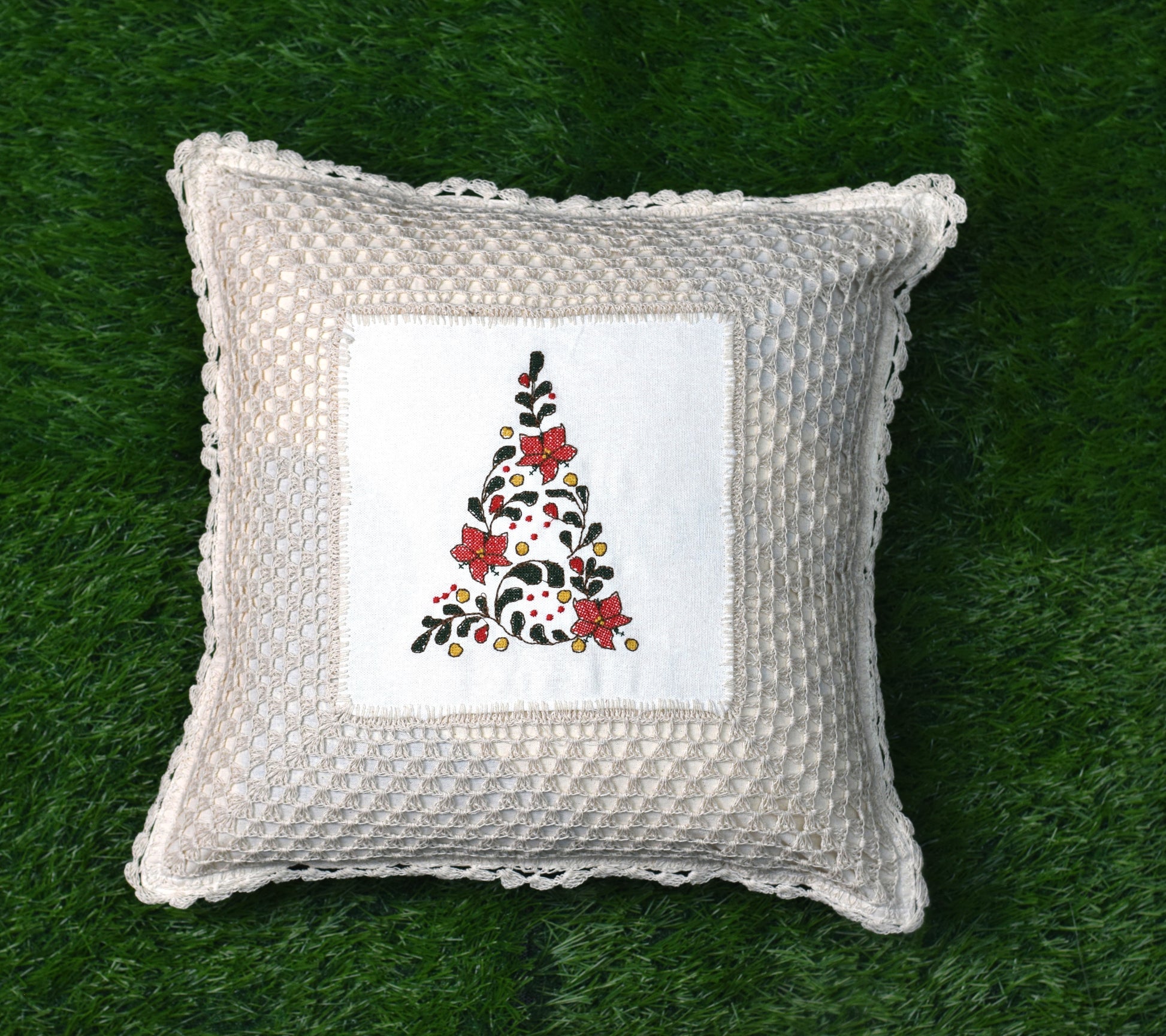 Add a warm festive charm to your home décor with this elegant Christmas cushion cover set. Crafted with a textured waffle-knit fabric and finished with a delicate crochet lace border, these cushion covers feature a beautiful embroidered Christmas tree motif at the center, highlighted with floral accents.