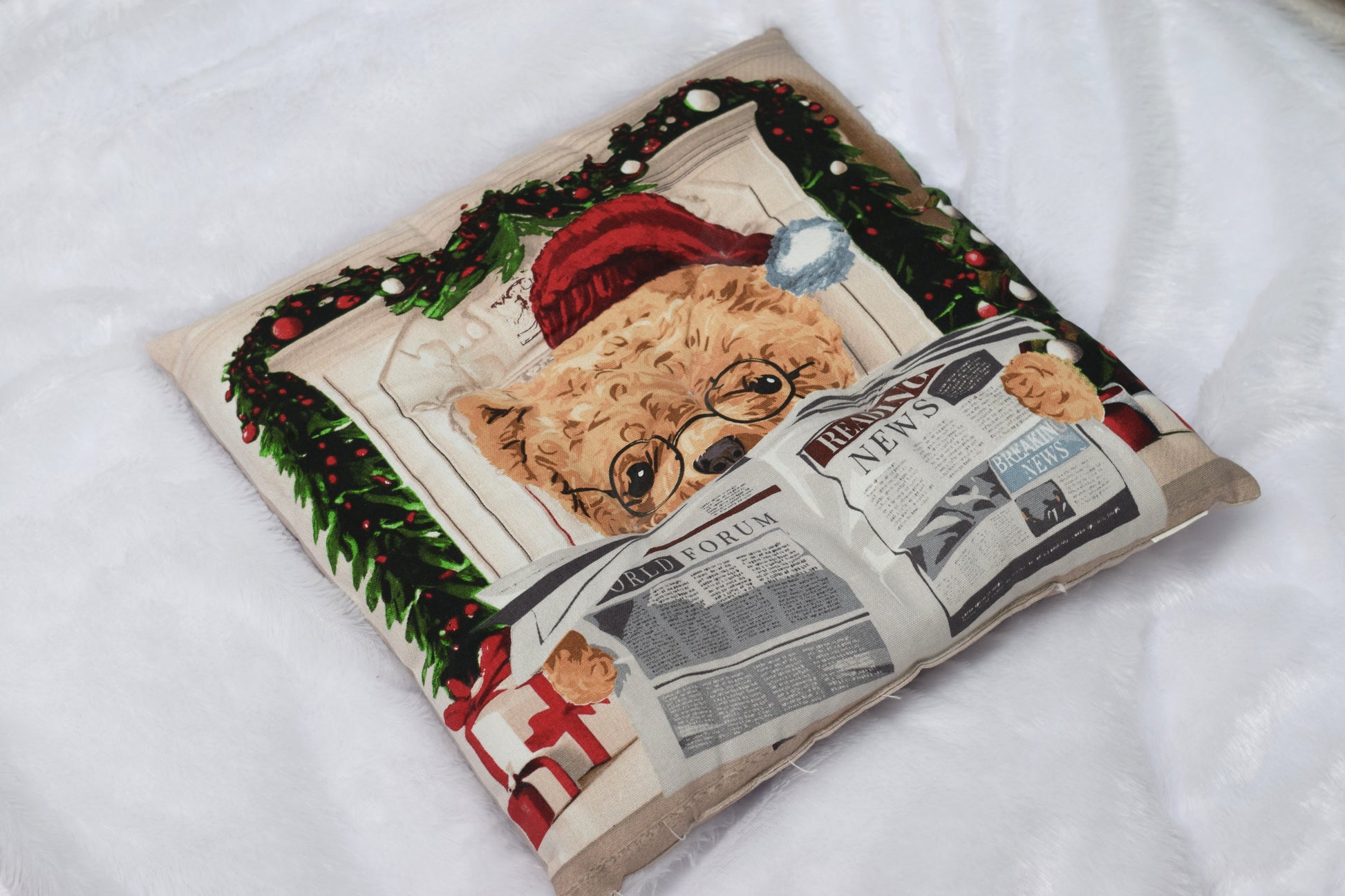 Christmas Teddy Reading Newspaper Cushion – 16x16 Inch