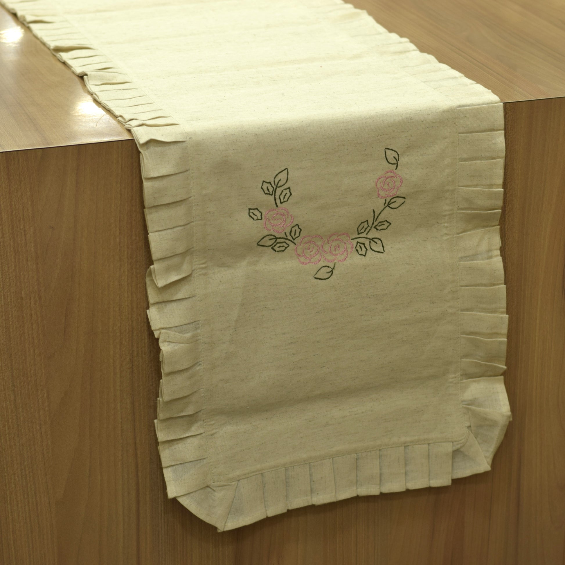 Add timeless charm to your dining space with this beautifully embroidered floral table runner. Crafted from premium cotton fabric, it features delicate pink rose embroidery and neatly pleated edges that bring a soft, sophisticated touch to any table setting. Perfect for dining tables, consoles, or buffets, this 14x90-inch (35.6x228.6 cm) runner blends elegance and simplicity, enhancing both everyday and festive décor.
