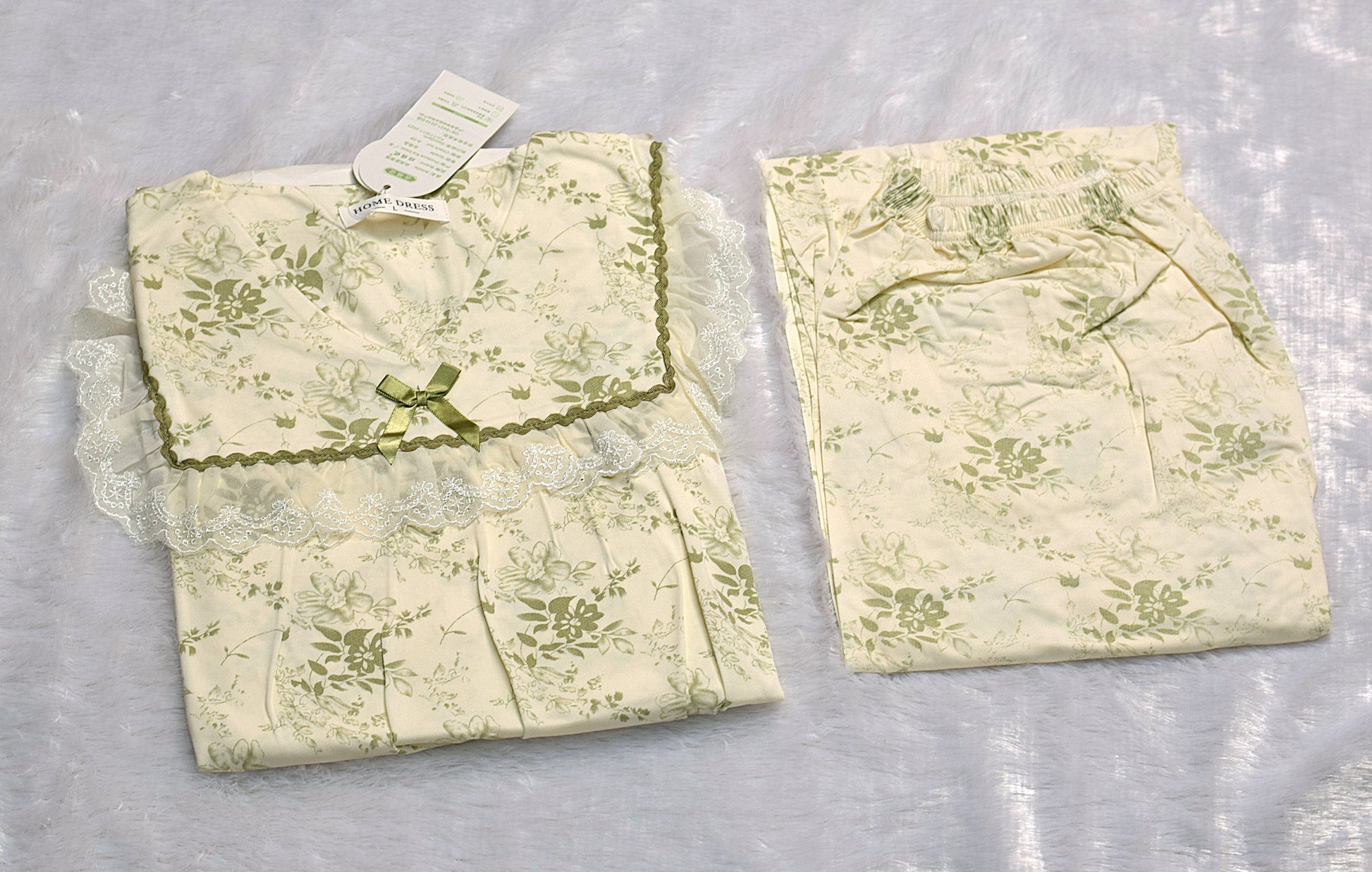 Unwind in timeless elegance with this charming floral night dress set. Designed in a soothing cream base with delicate olive green floral prints, it features a beautifully detailed lace trim and a satin bow accent for a graceful touch. The soft, breathable fabric ensures all-night comfort, while the matching pants complete the cozy yet stylish look.