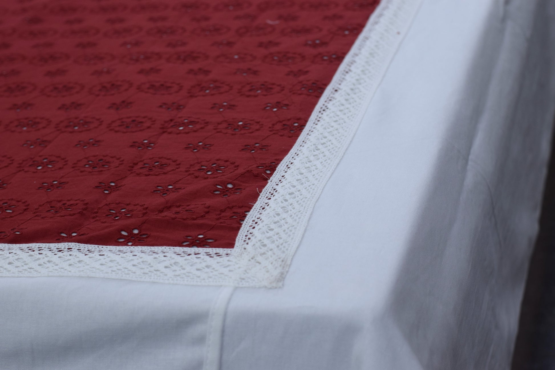 Elegant Brick red & White Cotton King Size Bedspread with Lace Border
