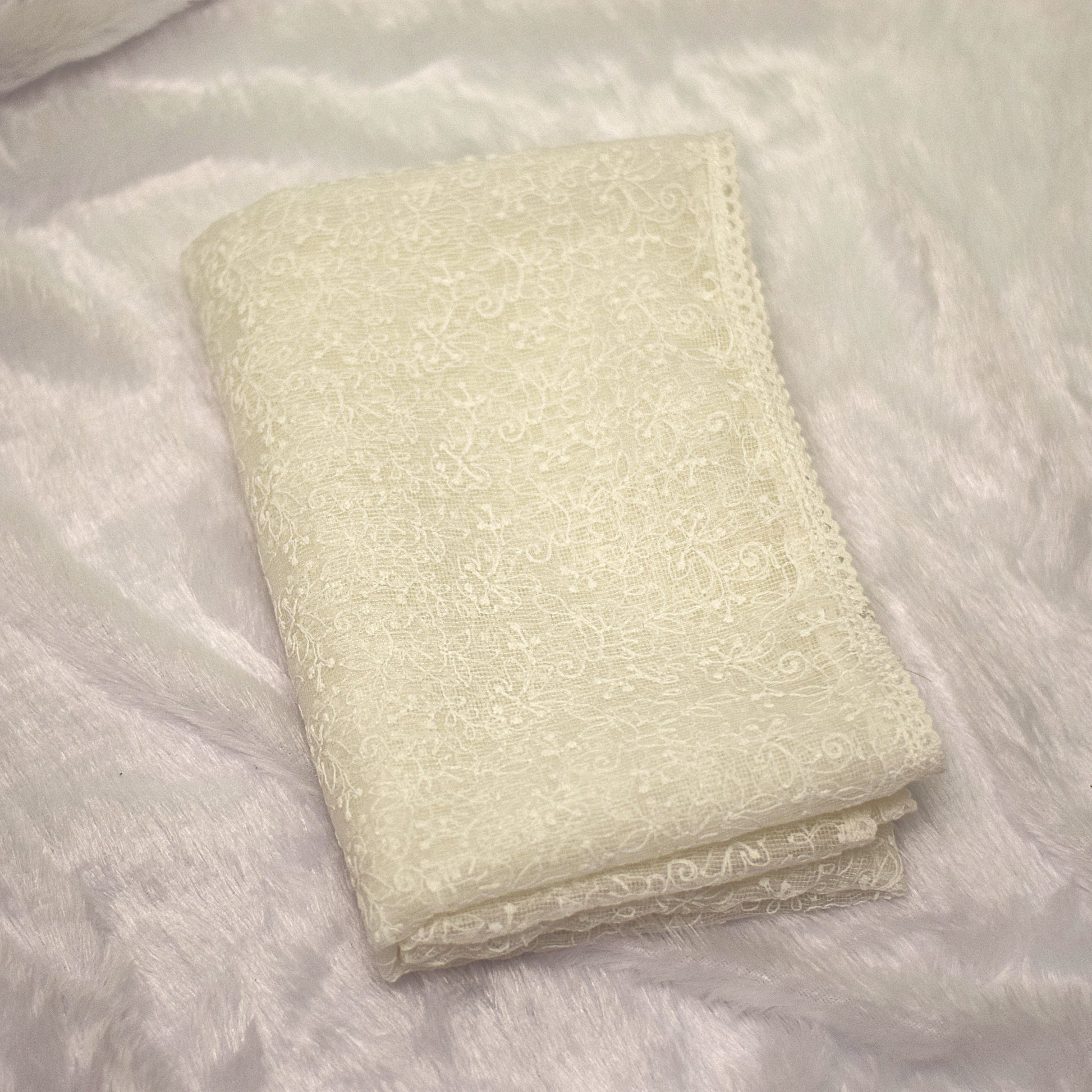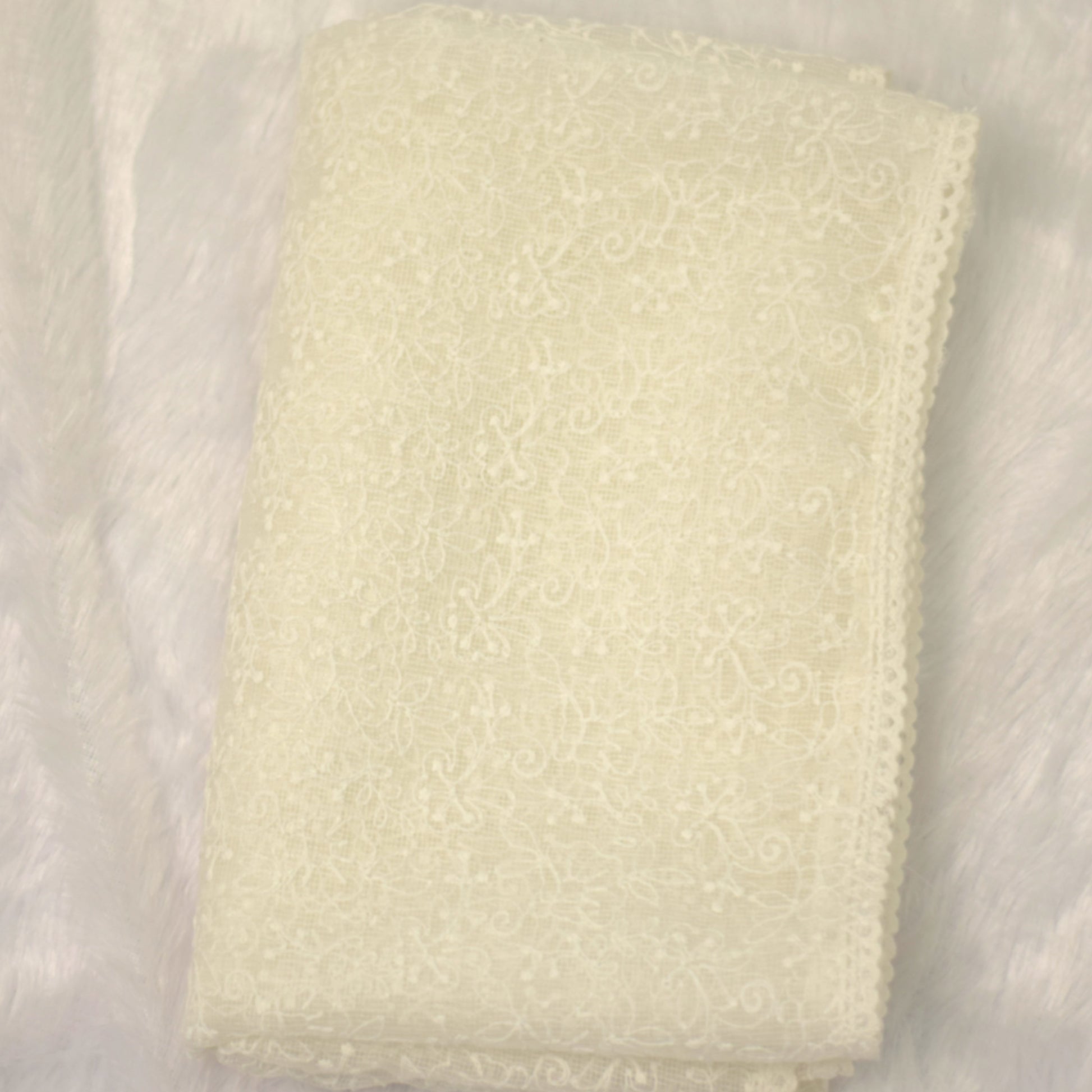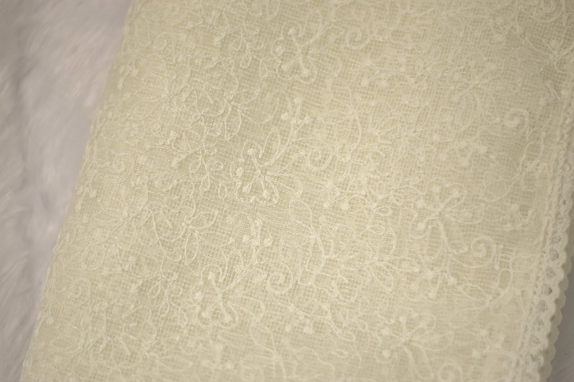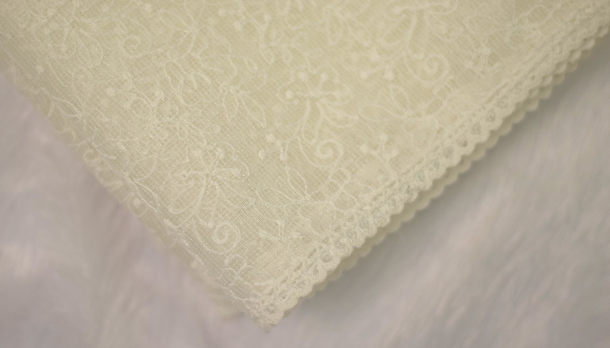 Design: All-over floral embroidery with lace border