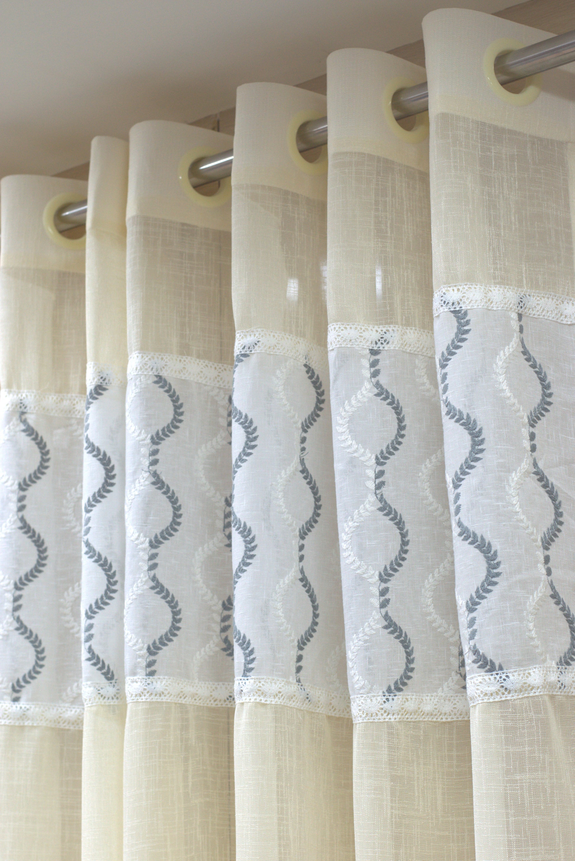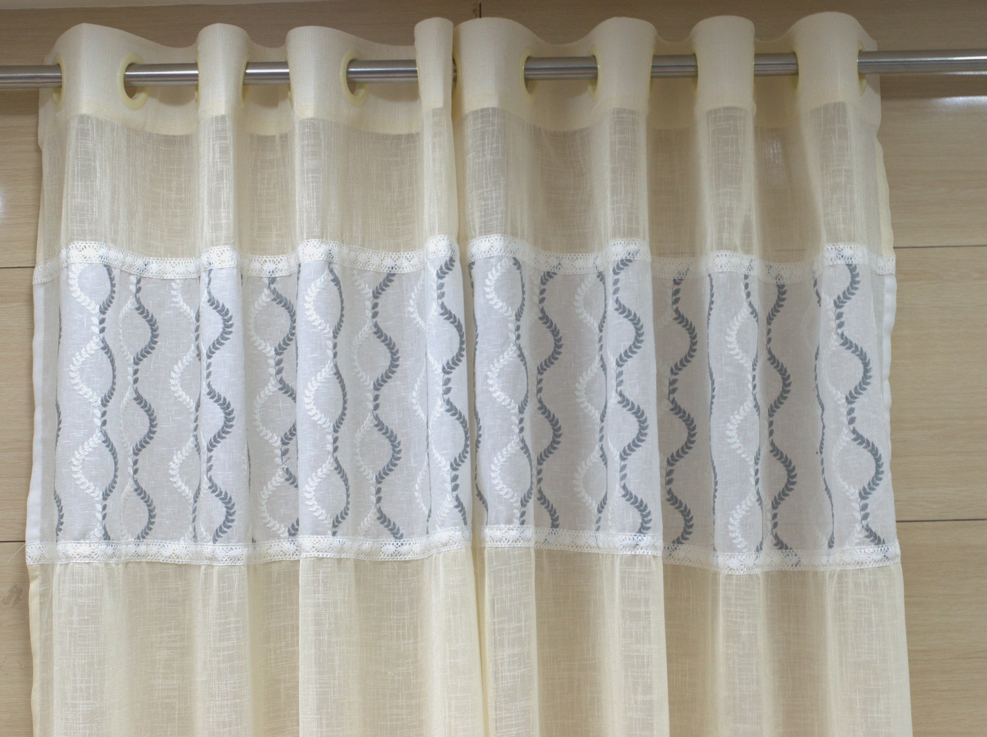 The curtain features a delicate embroidered pattern with lace detailing, adding a touch of sophistication and charm. Its neutral cream shade blends effortlessly with modern, classic, or minimal interiors, making it ideal for doors, balconies, kitchens, or pooja rooms.