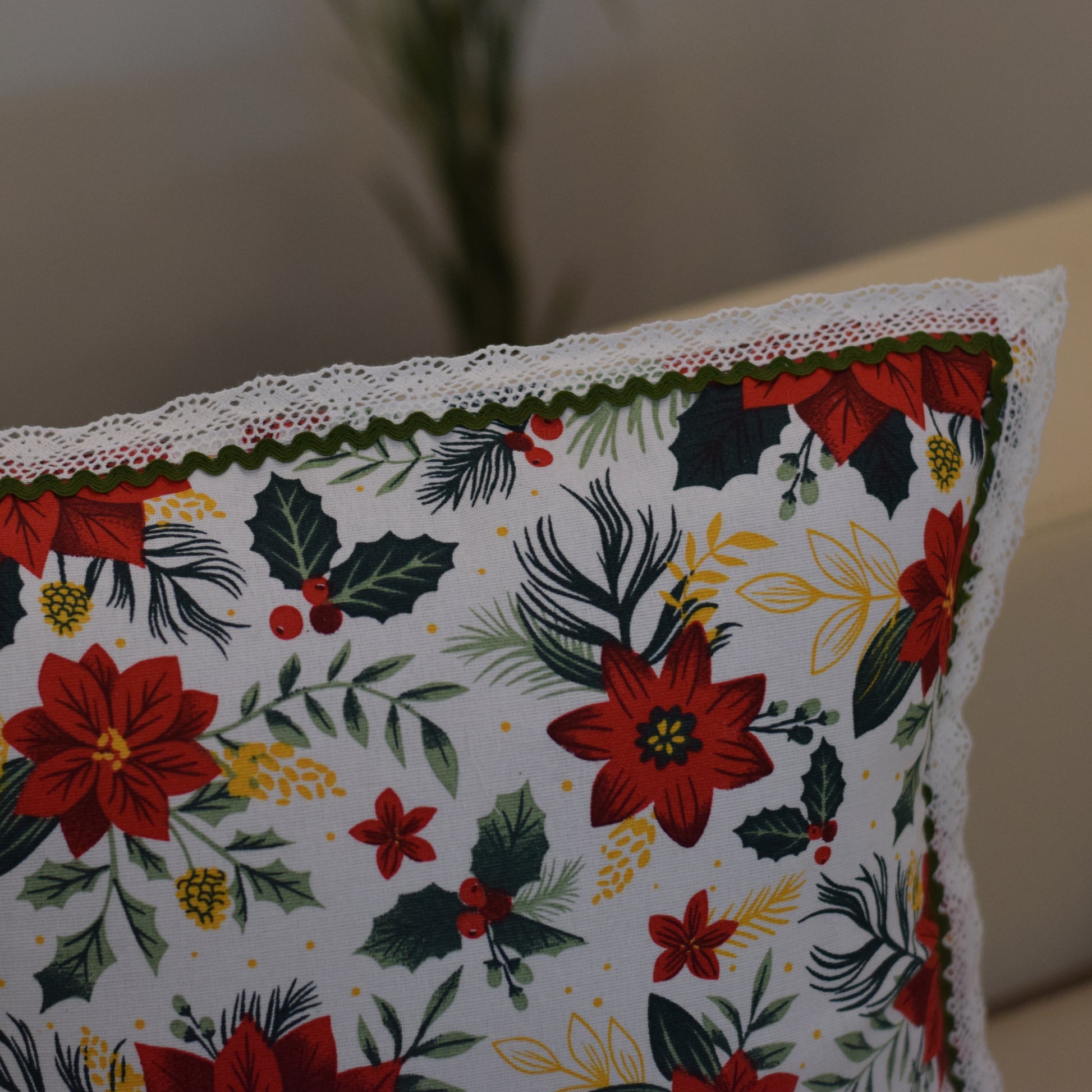Add a vibrant touch to your living space with this beautifully designed cushion covers. Featuring bold red floral prints on a soft cotton blend fabric, these covers bring elegance and charm to your sofa, bed, or lounge. The delicate lace border enhances the festive appeal, making them perfect for both everyday use and special occasions.