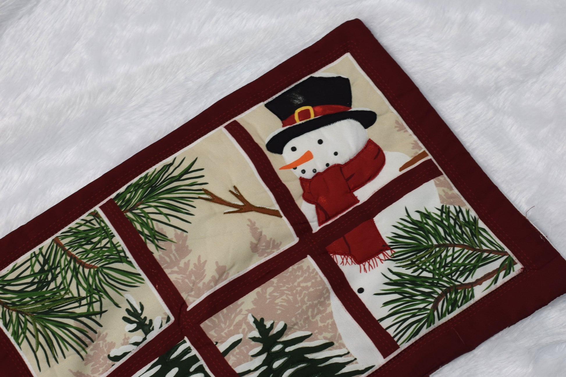 Bring holiday warmth to your dining table with this charming Festive Snowman Window View Table Mat. Measuring 20 x 14 inches, it features a cheerful snowman peeking through a window framed with evergreen branches and snowy pine trees. The rich maroon border adds a classic Christmas touch, making it perfect for your festive table settings. Crafted with quality fabric and detailed print, this table mat is ideal for decorating your dining area, coffee table, or sideboard during the holiday season.