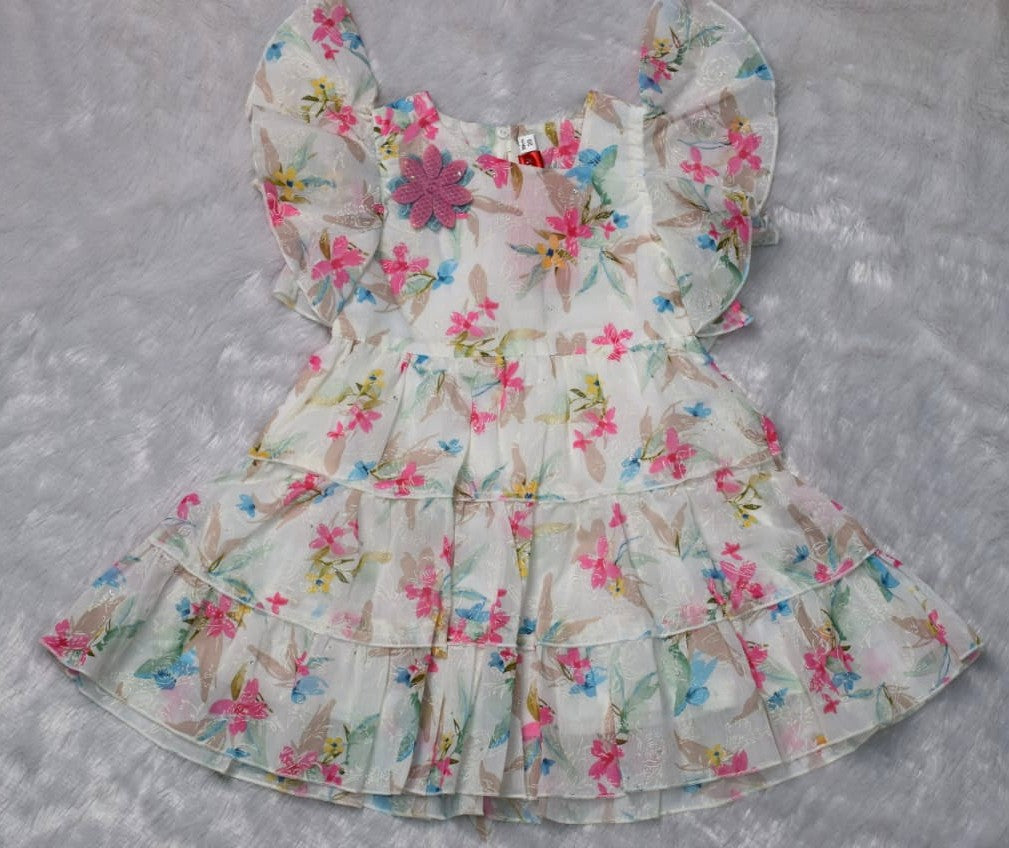 The frock is styled with cute butterfly sleeves and a layered ruffle skirt that creates a lovely flow and movement. A neatly stitched back zipper ensures easy wear, while the comfortable fit makes it perfect for kids to enjoy special moments freely.