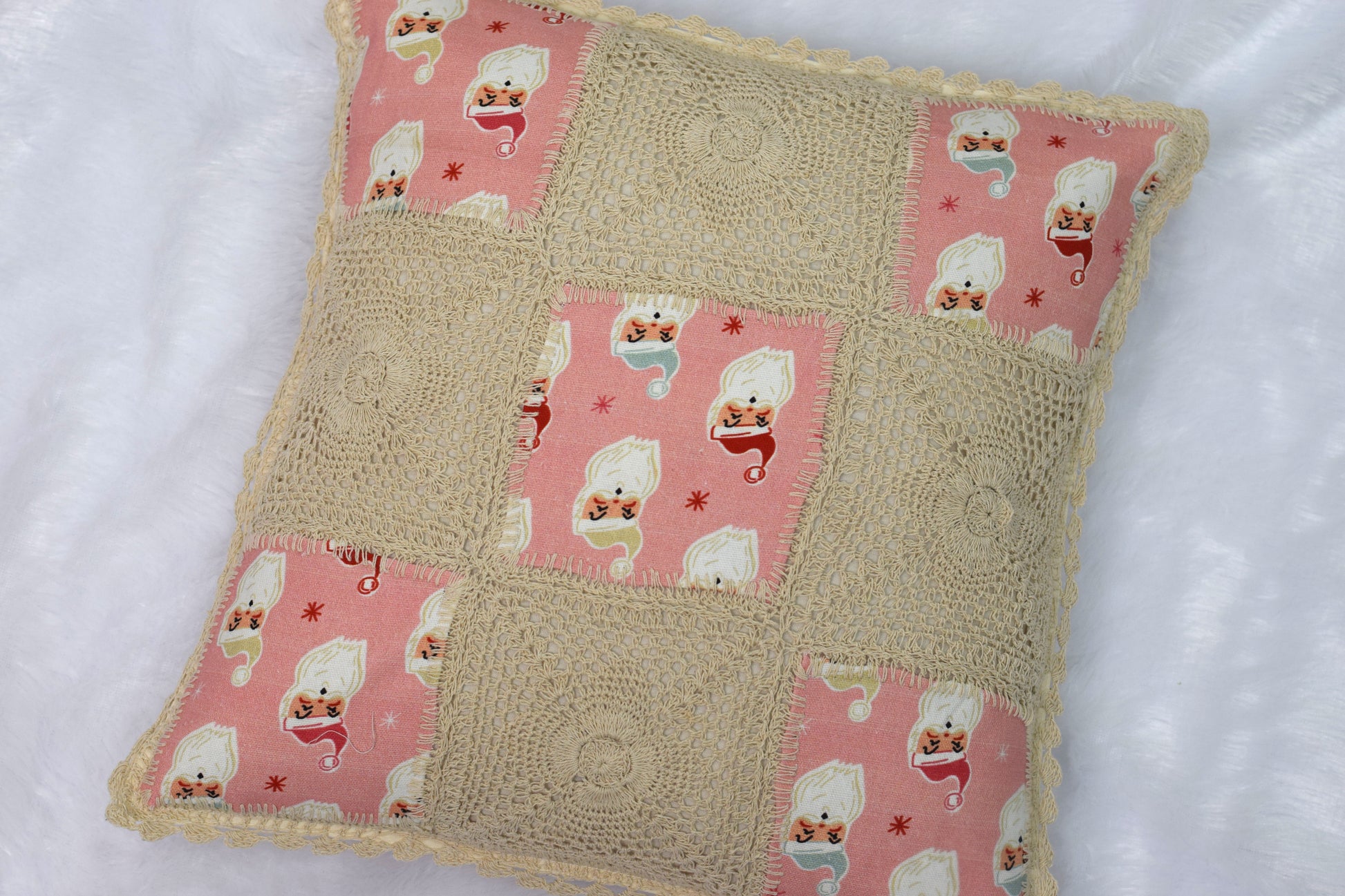 Add a cozy and charming touch to your home with this handcrafted 16x16 inch cushion cover. Designed with a unique blend of beige crochet panels and cute printed cotton fabric in soft pink tones, it brings a perfect mix of vintage and playful style. The detailed crochet work and scalloped edges add a handmade elegance, making it ideal for your living room, bedroom, or festive décor.