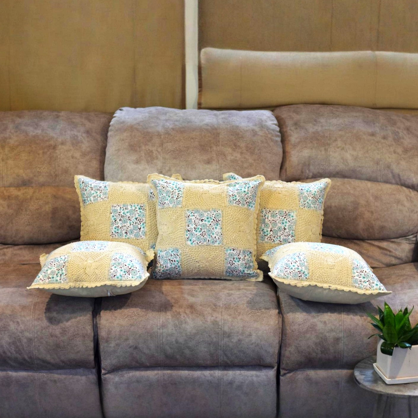 Enhance your living space with this beautiful handcrafted cushion covers. Featuring a charming patchwork design with floral prints and crochet-style detailing, these covers bring a touch of elegance and coziness to your sofa, bed, or lounge area. Made with soft, durable fabric, they are easy to maintain and perfect for everyday use or special occasions.