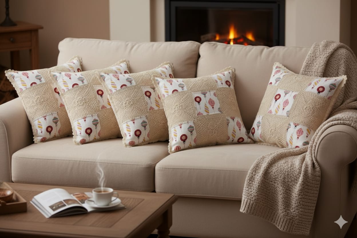 Add a cozy and artistic touch to your home décor with this Handmade Crochet Patch Cushion Cover. Measuring 16x16 inches, this beautiful cover features a unique mix of beige crochet squares and festive ornament print fabric, creating a charming patchwork style. Perfect for living rooms, bedrooms, or as a decorative accent during the holiday season.