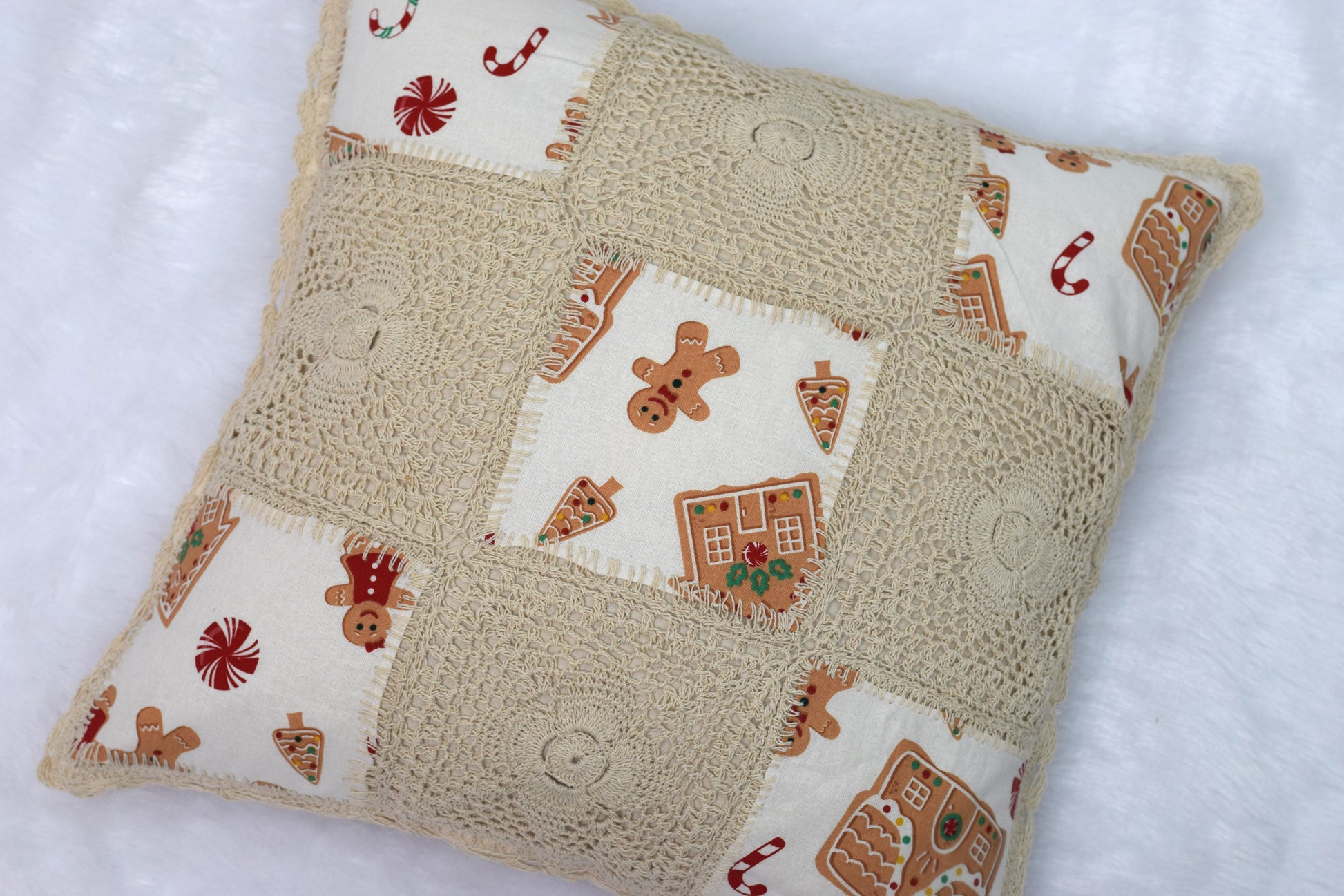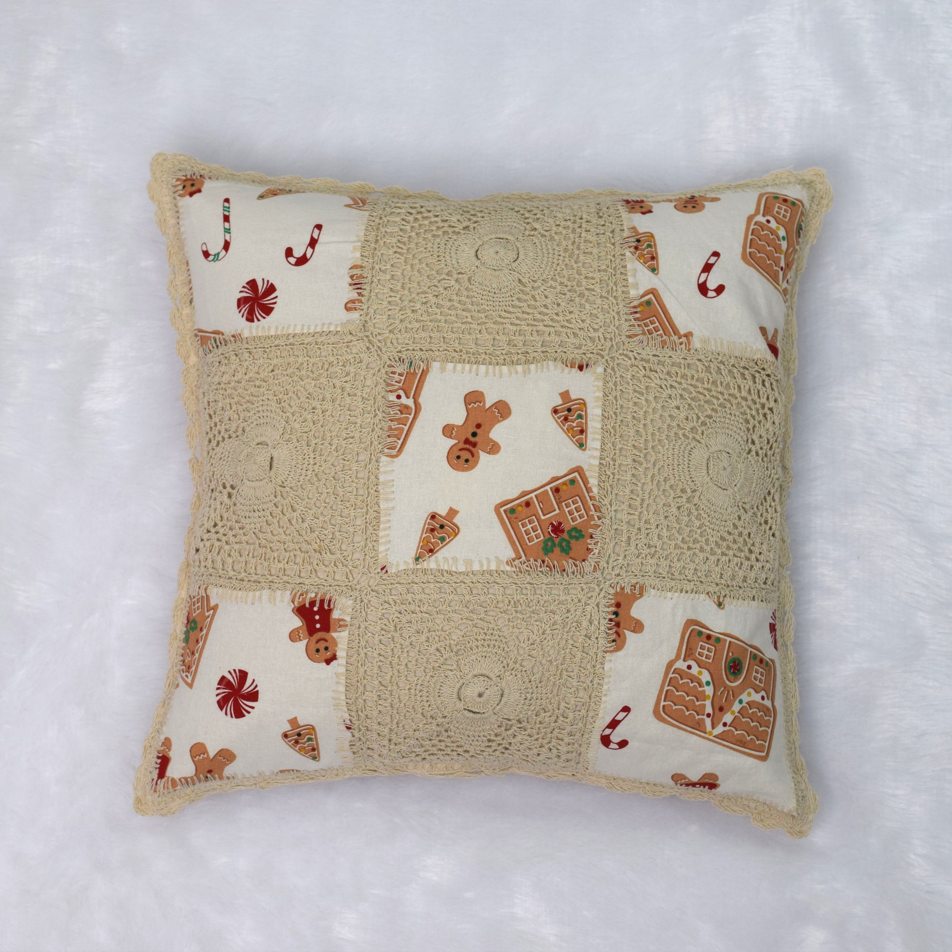 Add a cozy festive touch to your home with this Handmade Crochet Patchwork Cushion Cover. Beautifully crafted with a mix of intricate crochet squares and Christmas-themed fabric featuring gingerbread men, candy canes, and gingerbread houses. The soft beige crochet border enhances its charm, making it perfect for holiday décor or gifting.