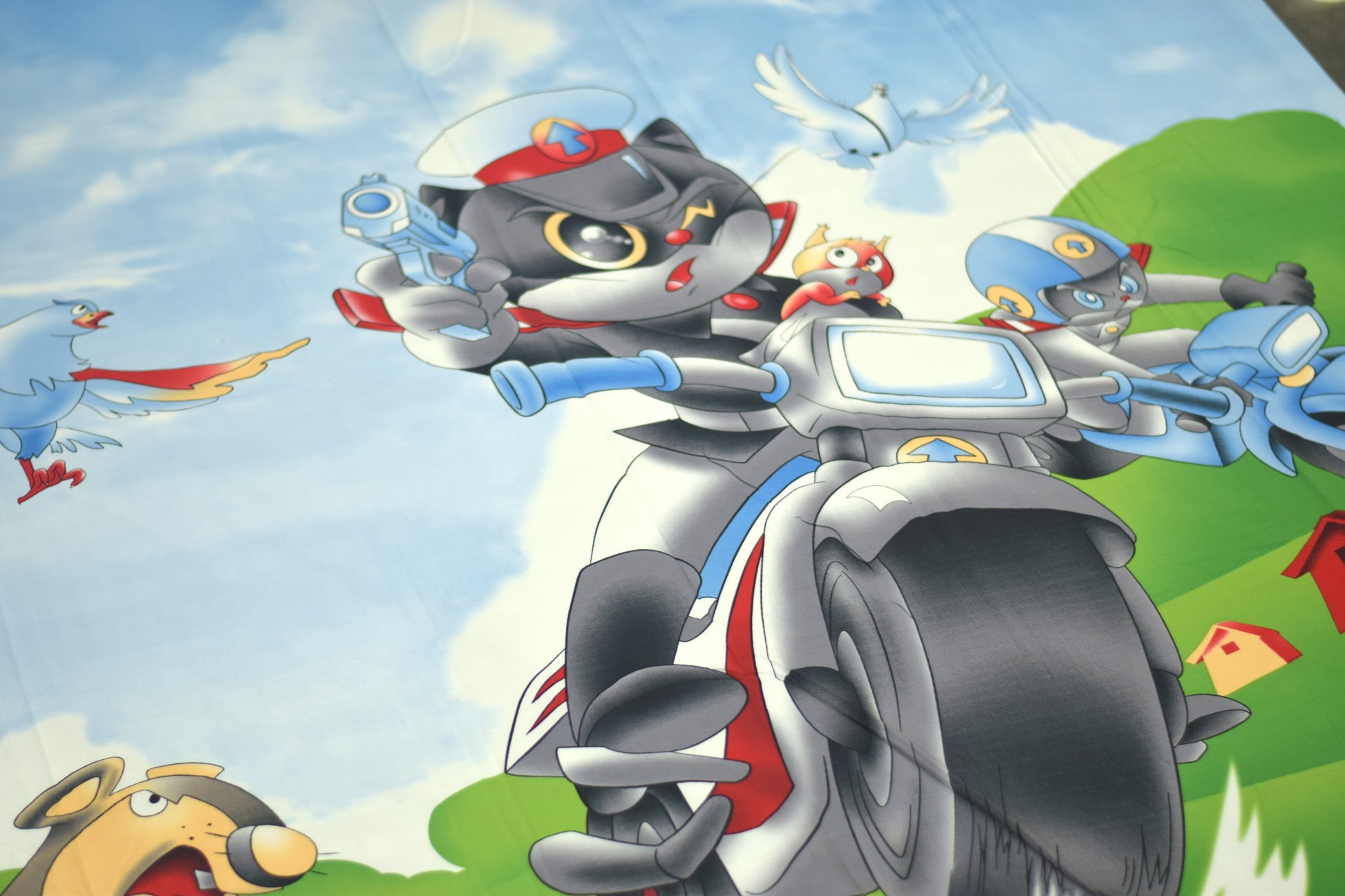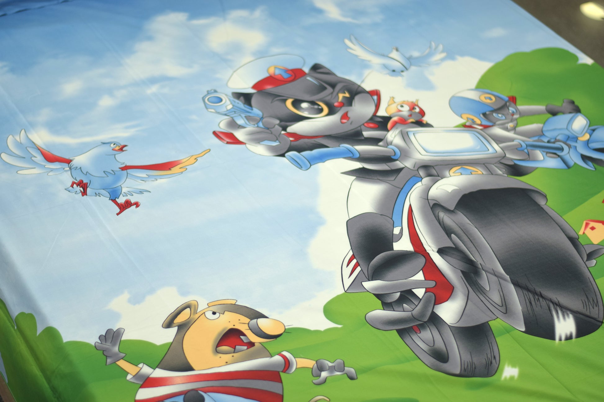 Bring fun, colour, and imagination to your child’s room with this Kids Cartoon Adventure Queen Size Bedsheet Set. Designed with vibrant animated characters riding bikes and playful birds soaring in the sky, this bedsheet adds an exciting and cheerful vibe to any bedroom.