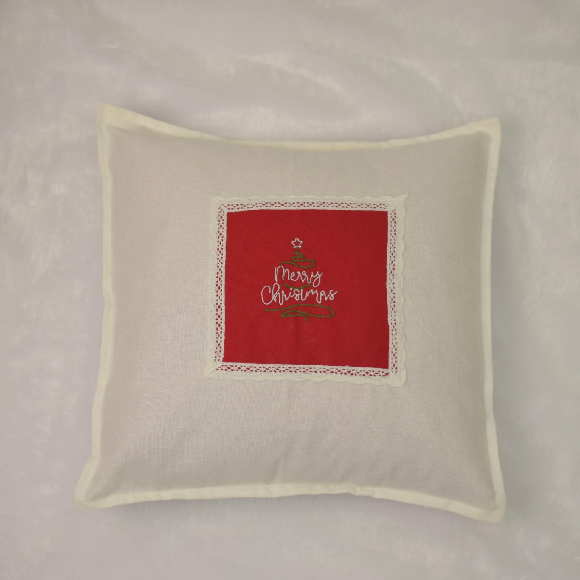 Add festive charm to your home with this beautifully crafted Merry Christmas Cushion Cover (16x16 inch) Set of 2. Made from soft, high-quality fabric, it features a red embroidered Christmas tree design at the center, framed with delicate lace detailing. Perfect for your living room, bedroom, or holiday décor, this cushion cover brings warmth and seasonal cheer to any space.
