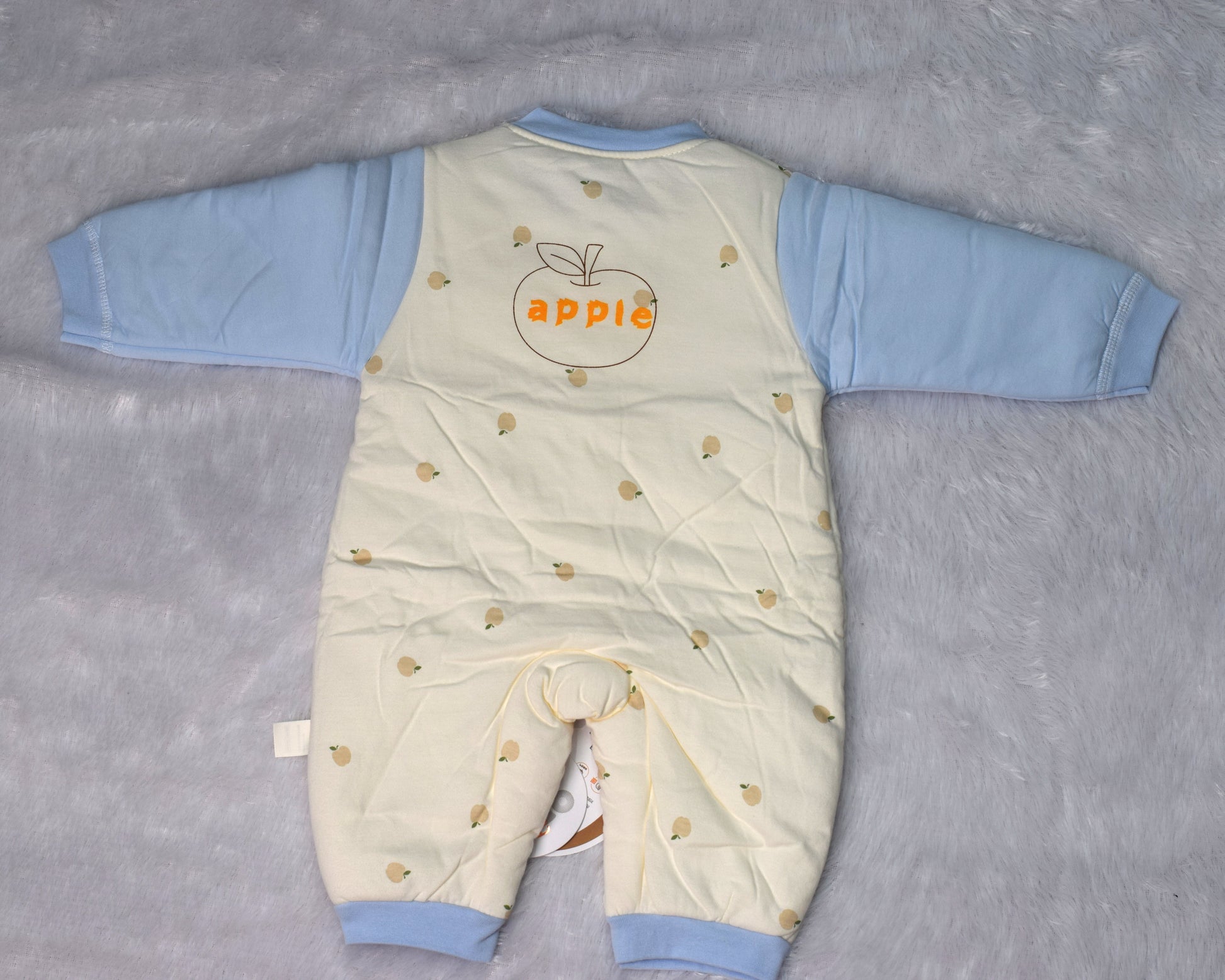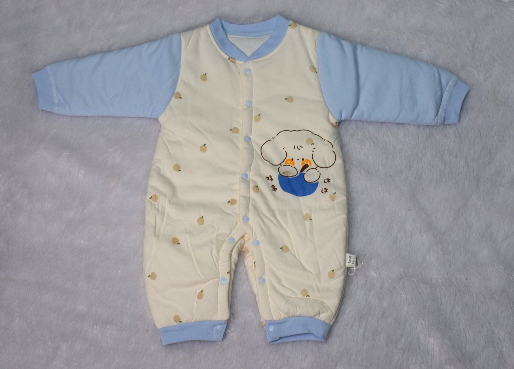 Charming Design: Features a cream-colored body adorned with a repeating mini-apple or fruit print and a large, sweet cartoon puppy graphic on the chest. The sleeves, collar, and cuffs are a lovely contrasting light blue.