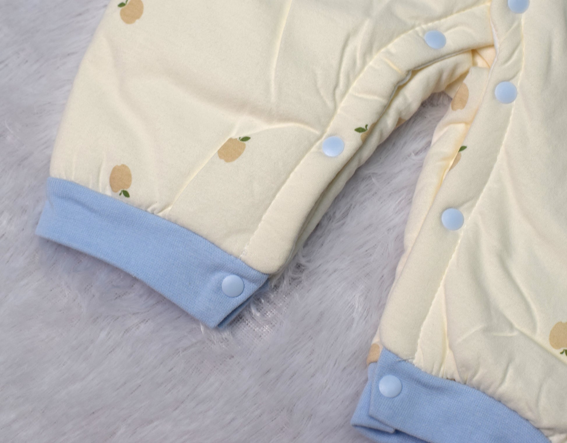 Easy Dressing Snaps: Equipped with a full-length line of light blue snaps running from the V-neck opening down to the crotch, allowing for quick diaper changes and hassle-free dressing.