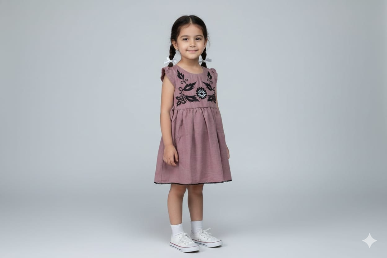 Add a touch of elegance to your little one’s wardrobe with this beautiful cotton frock for girls. Designed with delicate black floral embroidery on the yoke, this frock combines comfort with timeless style.