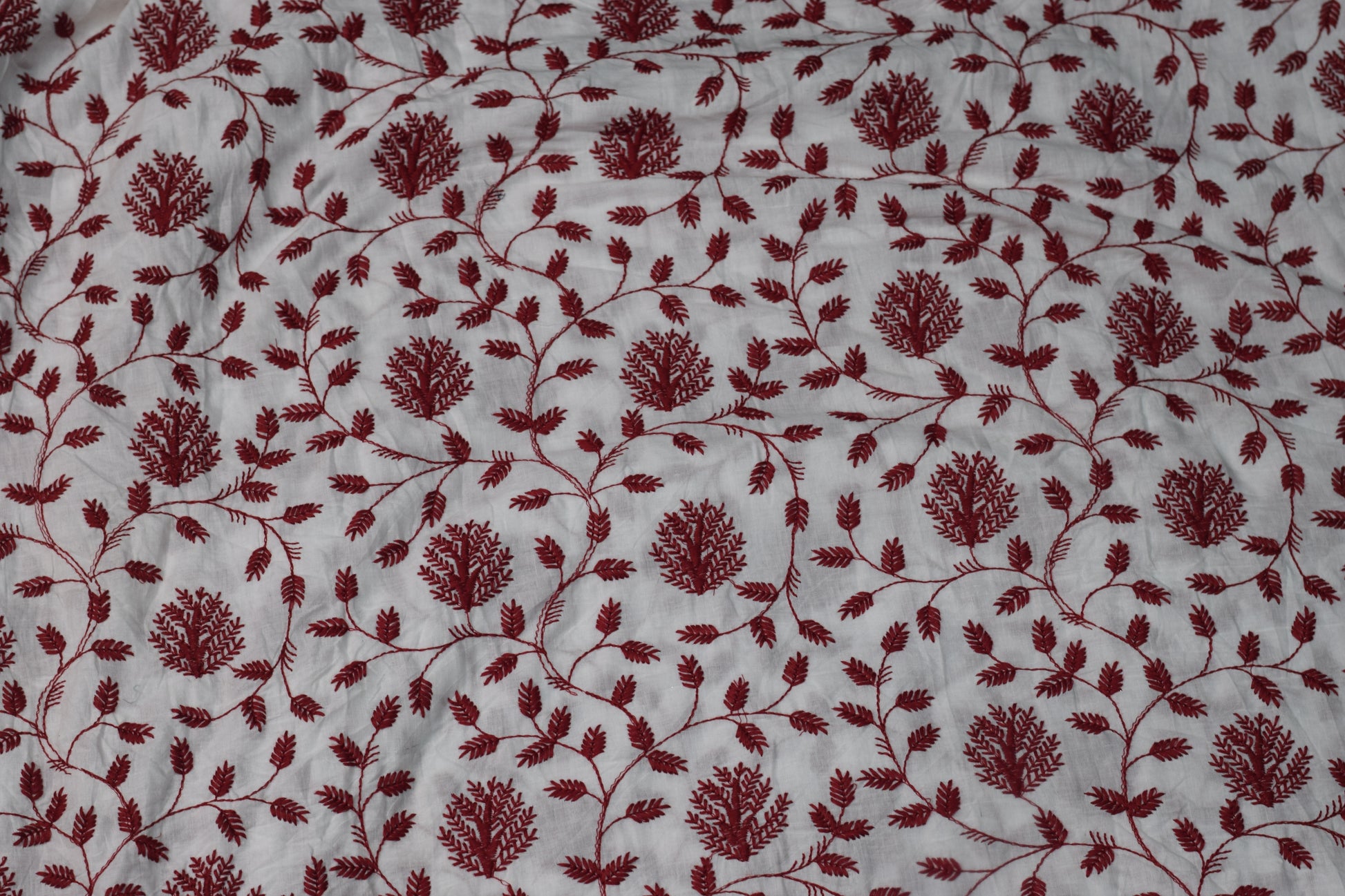 Bring a touch of elegance to your wardrobe with this beautifully embroidered soft cotton dress material. The fabric features a white base adorned with rich maroon thread embroidery in a leafy, floral pattern that adds a refined, handcrafted charm. Made from breathable and lightweight cotton, it drapes comfortably and stays gentle on the skin—perfect for all-day wear.