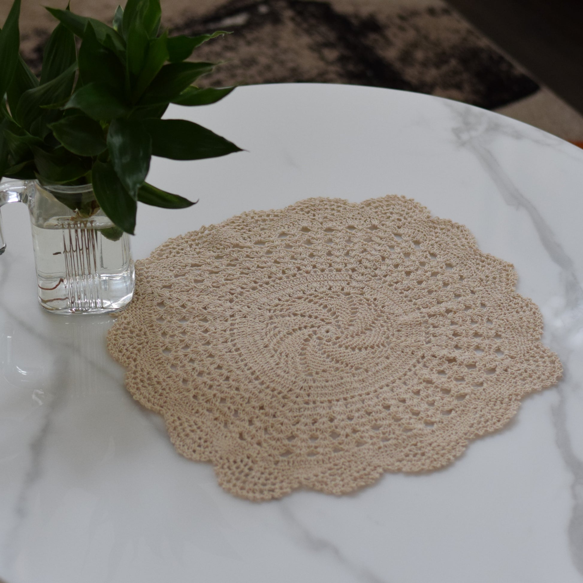 Title: Handmade Beige Crochet Doily – Elegant Round Table Decor