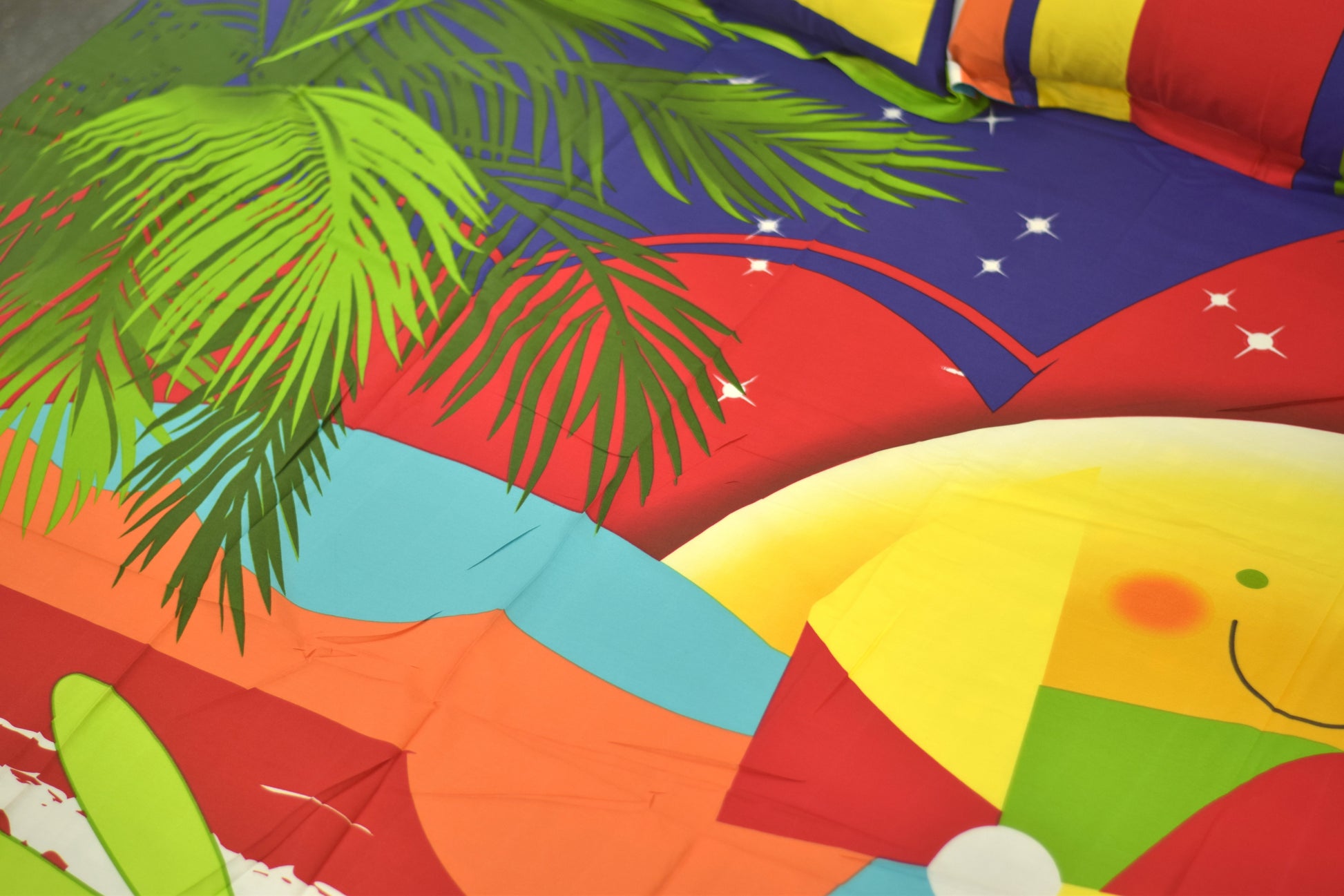 Brighten up your room with this colourful queen size bedsheet set featuring a fun beach-themed cartoon print. The bold rainbow stripes, sunset tones, palm leaves, and cute character design add a lively, cheerful vibe to any bedroom. Made from soft, comfortable fabric, it’s perfect for everyday use and easy to wash. Comes with matching pillow covers to complete the look.