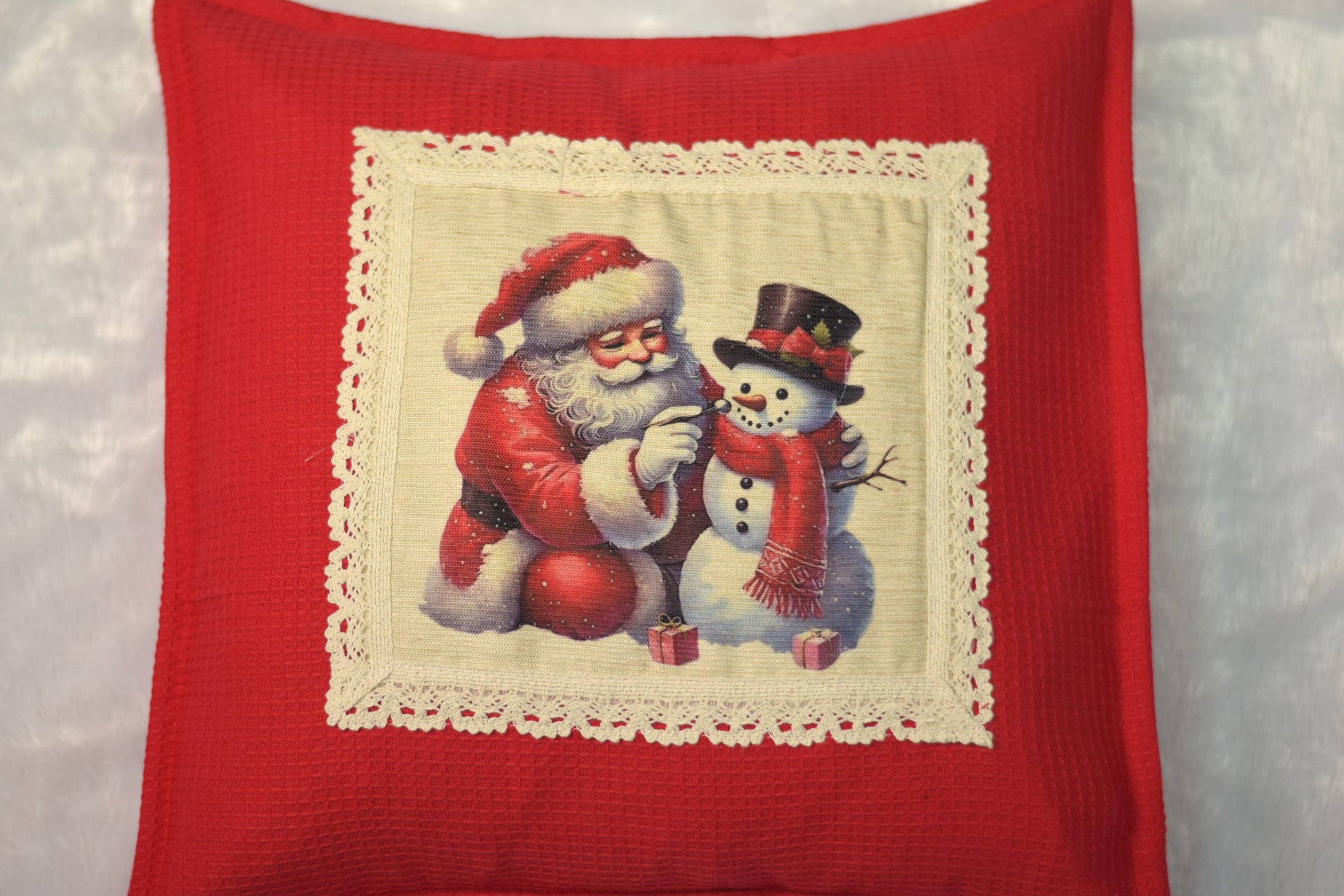 Vintage Santa & Snowman Christmas Cushion Cover - Honeycomb Knit, Lace Trim